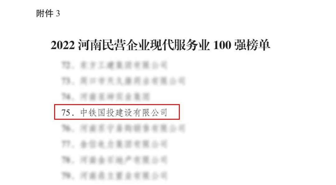 喜報!中鐵國投建設(shè)有限公司榮登“河南民營企業(yè)現(xiàn)代服務(wù)業(yè)100強”榜單